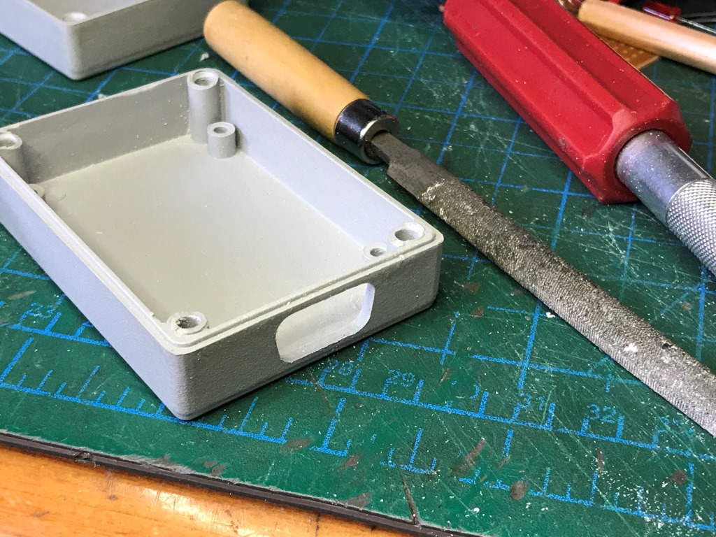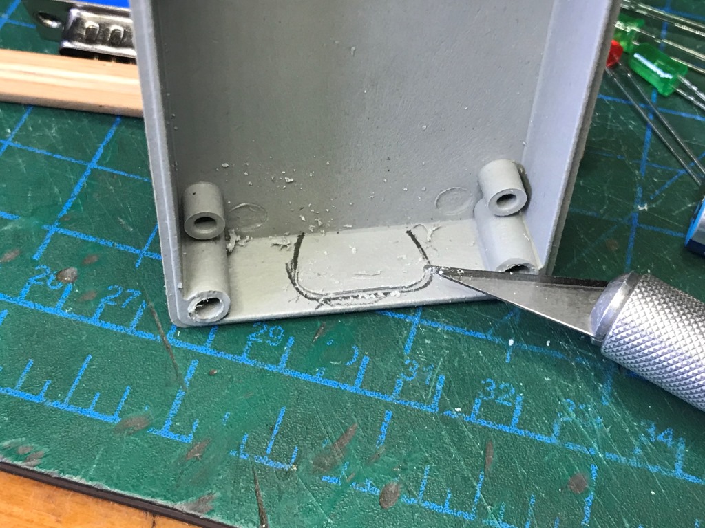 Plastik proje kutularının en güzel tarafı sağını solunu rahatça delip anahtar LED vs için yer açabilmeniz. Ama en gıcık tarafları ise böyle kavisli konnektör deliği açma kısmı. Konnektörün yerini kabaca kalemle işaretledikten sonra sabırla zar azar deliği oymanız lazım. Püf noktası işaretli kısıma çok yaklaşmadan deliği açıp geri kalan kısmı bir eğe ile yavaş yavaş deneyerek konnektörü defalarca prova ederek deliği genişletmek.
