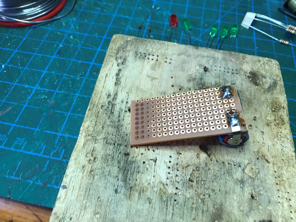 Tüm bu malzemeleri havada birbirine lehimlemek de mümkün ancak minik bir delikli plaketiniz varsa işlem daha temiz ve rahat olur.  İşe önce pili delikli plaketin bir ucuna lehimleyerek başlıyorum. Burası devrenin başladığı nokta olacak...