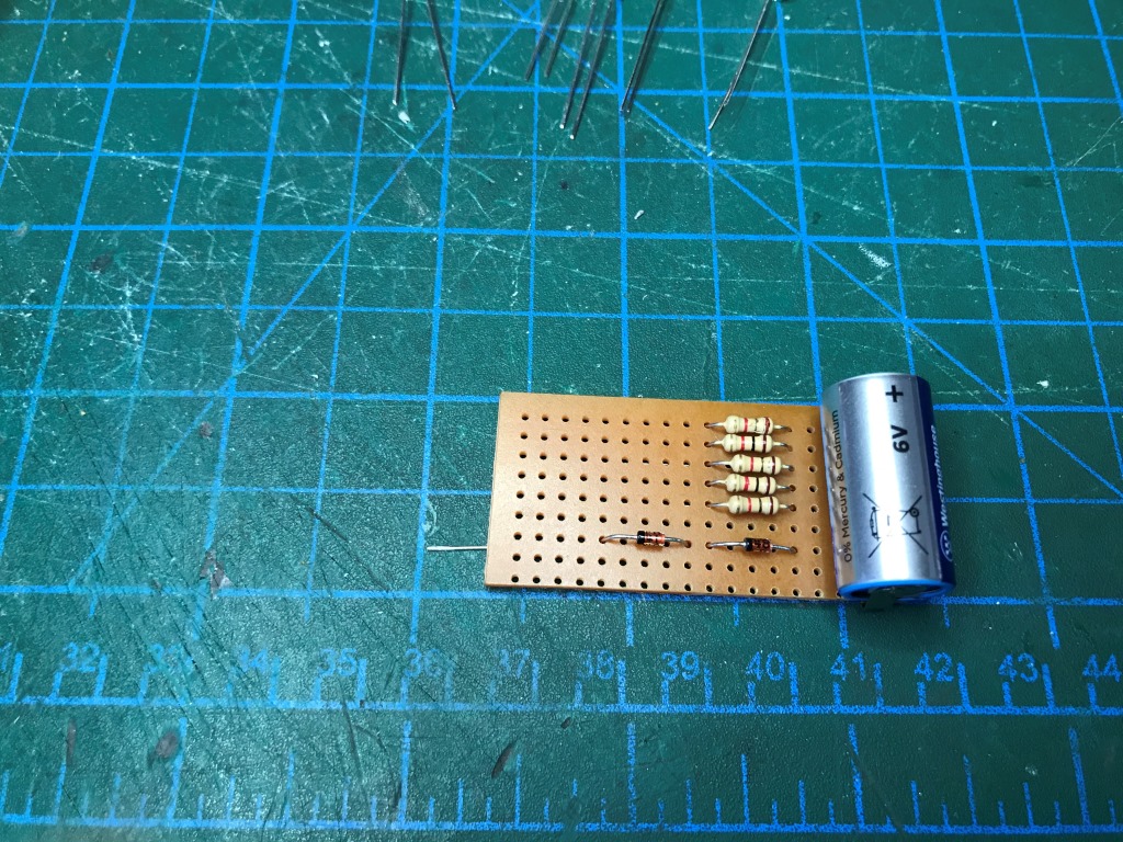 Dirençlerin bir ucu birbirlerine ve pil'in (+) kutbuna bağlanacak. Diğer uçları ise daha sonra ayrı ayrı LED'lere bağlanacak ama şimdilik yerlerine sabitlemek için plakete lehimliyorum.